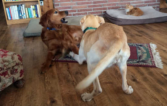 Alana loves her walks with our resident dog Beau. She has no leash discipline whatsoever, so our next step will be starting to introduce her to a Gentle Leader Head Collar. We found out yesterday that she also enjoys playing. She enticed our blind resident dog to play with her, and it was wonderful to see how gentle she was with him. Here is a short video.