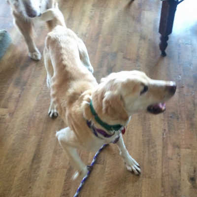We took her to the vet on Wednesday, and we are glad to report that medically, she checks out just fine. They estimated her age to be about 6 years old and that she is a (mostly) Lab mix. Doctor Amanda was concerned about her weight, of course. She recommended that we not have her spayed until her weight gets up to 60 lbs. She is on a diet of three feedings a day of a high-protein, high-fat dog food (similar to what hunters give their field dogs during hunting season). Our first job will be to put some weight on those bones! We won’t be walking her longer distances at first so that she doesn’t burn large amounts of calories, but instead, turns them into fat and muscle.
