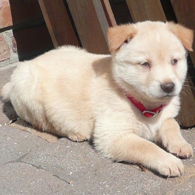 Alfie is one of seven puppies of Ava 11-088. He is light golden in color with a thick, rich, coat and darker ears.