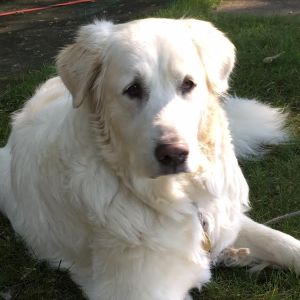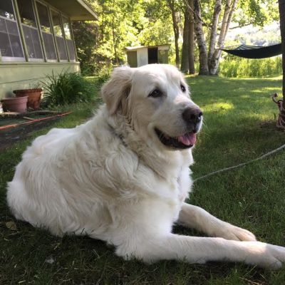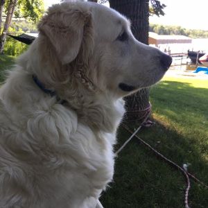 Meet Bella (fka Angel): A beautiful, gentle giant! Bella is a 6 year old female Golden Retriever/Great Pyrenees mix living in Bloomington, MN . She currently weighs 84 pounds and is one big, white, furry bundle of love!