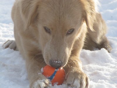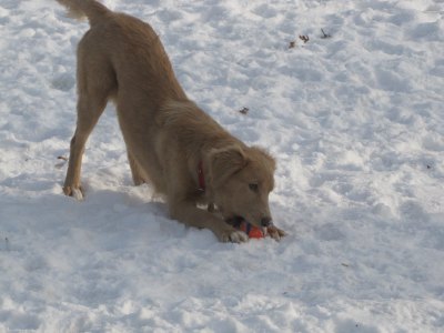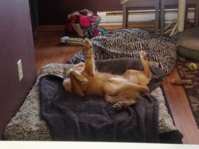 This cute golden mix girl came all the way from Alabama. She arrived in a huge transport van that was filled with dogs. I was there when unloading all of the dogs. When it was Auburn's time to come out of the kennel, she was so scared and wouldn't walk on the leash, so I had to carry her to my vehicle. When we arrived home, I had to carry her into the house. She would stay low to the floor. As soon as she saw the resident dogs she lit up and started mingling with them.
