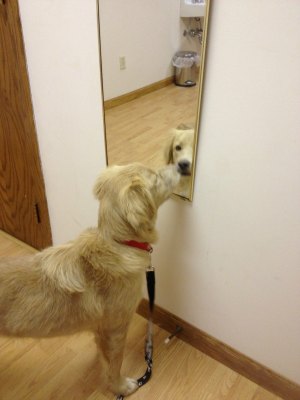 At her wellness check she weighed in at 34 lbs. The vet estimated her age at 7-10 months. Right now we are treating her for hookworms and ear infections. Later this week she will be spayed. While in Alabama, she was brought up to date on her shots. While looking over her vet papers from Alabama, she also had fleas and ear mites when dropped off at the shelter. Here at our house, she has been itching and biting her skin. At our vet, the doctor didn't find any fleas and couldn't explain why she would be doing this. I thought it was cute while at the vet, she kept going back to the mirror to look at herself (see picture below.)