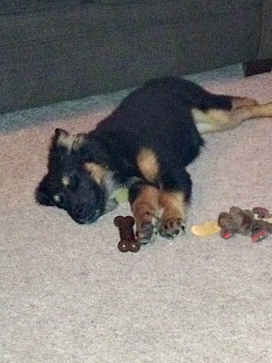 She rides in the car very well, typically curling up in the back seat for a nap. She is quickly becoming accustomed to walking on a leash, and is curious about the world around her. We have begun working on "sit," and she is catching on quickly. She recognizes her name, loves to chase a ball, and adores snuggling on the nearest lap.