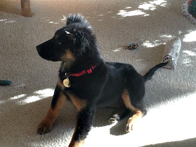 Housebreaking is going very well. She sits quietly while we put on the leash, and squats every time we take her outside and tell her to "go potty." She sleeps well in her kennel at night, and has been waking once during the night to go out--she wakes us by whining, then goes back to sleep afterward.