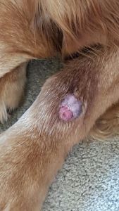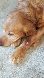 Welcome into foster care Belle! Belle was surrendered by her owner with one of her sisters, Belle is 8.8 yrs old, her DOB is March 12, 2007, she is very dark red and weighs in at 61 lbs. At this point she has very little feathering on her tail and legs but this will improve as her diet improves. She has some sore spots on her front legs, 4 to be exact; we're not sure how or why these are occurring. At first we thought it was hot spots but the vet said no; wondering if it is a nervous thing. They were infected when she came in and put on meds to heal. But they are still there, not healing very well, she licks them when she is in the kennel, so we're thinking nerves or stress. She also does have a heart murmur, to what degree we're not sure, her heart on an EKG just beats at a different rhythm. She was spayed on Wed, Nov 18, no more litters of puppies for Belle and did just fine with this.