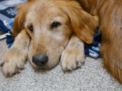Hello everyone, I'd like to introduce you to one of the two sweetest, most adorable Golden's in the RAGOM world. Big Bear is a 10 year old pure bred Golden Retriever. Big Bear and his brother Clover have a sad but hopeful story to tell. These two sweet, lovable boys were found wandering around alone, dumped in the woods in Indiana. No one knows how long they had been on their own but thankfully for these great dogs, a wonderful vet tech from Indiana saw them and spent an hour or so chasing them through the woods before she was able to catch them and get them to safety. Both boys were very skinny and covered in fleas. Their flea infestations are so bad that they are missing much of their hair and have secondary skin infections and allergies. They also had eye and ear infections. Big Bear is also heart worm positive. Lucky for these sweet guys they were taken in by a small rescue group who took them to a vet for care and posted them on Petfinders as urgent dogs needing rescue. Even luckier for Big Bear and Clover, one of our wonderful volunteers happened to see these boys and alerted our team to their urgent need of rescue. We immediately made contact with their rescuer and offered our help. Just a short time later transport was arranged and Big Bear and Clover made the long trip to Minnesota so they could start their new lives as RAGOM dogs.