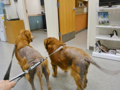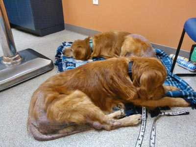 Arriving late in the evening, Big Bear and Clover spent the night with one of our super volunteers who gave them a warm, clean place to sleep and catered to their needs, giving them a ride to one of our vet offices in the morning so they could get started with their much needed medical care. Once at the vet we updated them on their vaccines and gave them a complete physical. Big Bear has an ear infection, not a big surprise. He is also has advanced heart worm disease and his x-rays show some thickening of the tissue between his heart and lungs. Big Bear is scheduled for an ultrasound tomorrow so we can determine the extent of his heart worm and what else is going on with his lungs. He does have a cough and seems very tired but is in good spirits. Big Bear is in pretty rough shape, weighed in at 59 pounds, underweight by 10 - 15 pounds. His coat is in very rough shape with almost zero hair on his tail, rear legs, back half of his body and hair loss on the underside of his front legs. He has many healing sores and scabs on his legs and back. He is still itchy but is not contagious. Through all of this, Big Bear is a very happy but tired boy. His tail wags whenever you talk to him and he is never more than a few inches away from his brother Clover. They are very bonded and give each other kisses and drink from the same bowl at the same time. Big Bear was so happy when I gave him a nice soft fleece blanket that he immediately laid down on it, let out a big sigh and quickly fell asleep. In fact he hardly woke up when the vet checked him over. Big Bear and Clover are spending a few days at the vet office so they can receive the medical care they need. Big Bear will receive several medicated baths, will start on medication to treat his ears and will have an ultrasound so we can determine what stage his heart worm disease is at and what other issues he is facing. He and Clover are comfortably sharing a kennel run so they are not apart. Big Bear and Clover will go to their foster home, again staying together in foster care, in a few days, once we are sure all medical issues have been addressed.