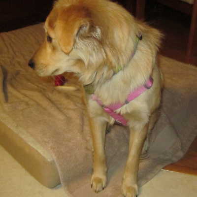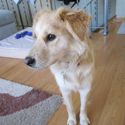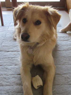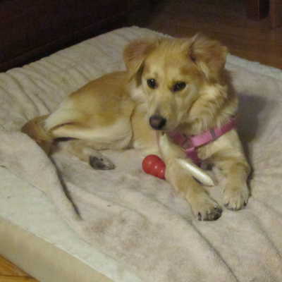 Blondie's a real sweetheart who wants to be friends with everyone she meets. She had my dogs wrestling with her within 15 minutes of her arrival. At her well doggy checkup, she insisted on making the rounds and even meeting the vet techs working in the lab area. Blondie hasn't chewed on anything inappropriate, but does know how to empty a toy basket. Bones, Kongs, and antlers seem to be favorites for gnawing; the jury's still out on the life expectancy of soft, stuffed toys. I'm not going to promise that she's fully house trained. She's had a couple of accidents, but that could be due to the stress of a cross-country transport. It could also be due to the stress of moving to MN in January -- especially this January!