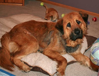 Bonnie is a 1 year-old female Golden Retriever mix that just arrived this week. She came into the RAGOM family with her two babies 12-013 Loki and 12-014 Callie, and was transported by our wonderful volunteers all the way from a reservation on the border of South Dakota and Nebraska. Bonnie has never been in a house and everything she does is a new experience. She is an incredibly sweet and smart little girl, and a wonderful mama. Bonnie mastered the stairs and wood floors on her first day, and even though she has free roam of our house, she has not had a single potty accident. We played fetch today with her tail wagging like crazy and she play bowed and pounced around…..such a happy girl for having a difficult start in life.