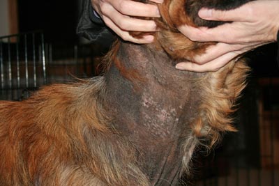 Bonnie will receive her final treatment of ivermac the first of February. It couldtake up to a year for her skin to completely heal and resume normal hair growth.