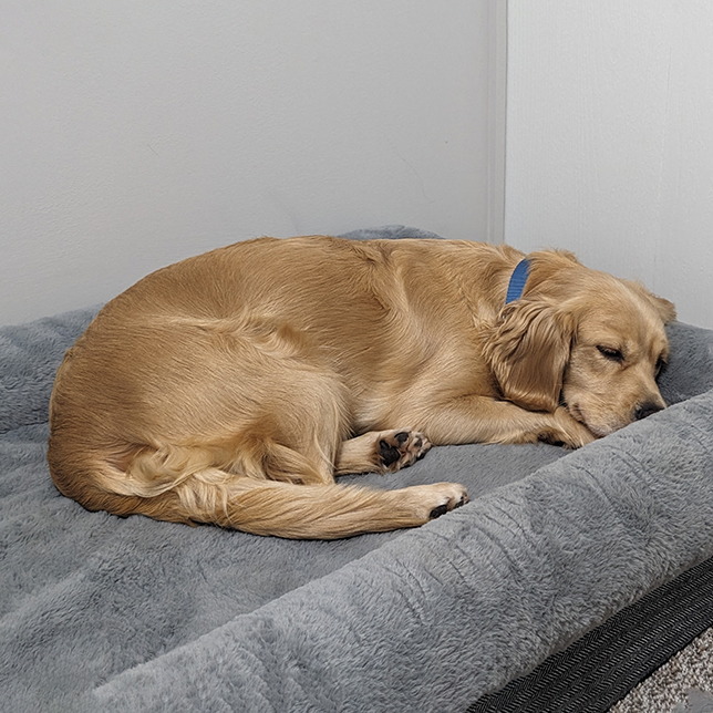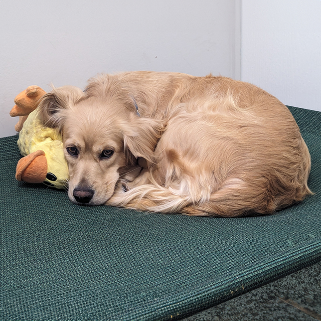 Brandy came into RAGOM from a commercial breeding environment. She is quite shy and scared of all the changes in her life. Any children in Brandy's future home should be age 10+. She must have a medium/large confident dog in her home to model and learn from. A physical fence is required to keep her safe. She can live with dog-savvy cats. Brandy will need a family with patience to allow her to adjust to her new home at her own pace so she can grow into a confident family member.