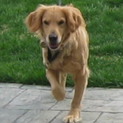 Bridget came into my home (with two goldens, foster golden Abby 11-376, and a 10 month old minigoldendoodle to welcome her) this past Saturday. Her behavior could be described as in a panic mode seeking any method to escape her new environment. By Sunday pm she was running in and out of the patio doors as if she had been doing it her whole life and on Monday pm her running had changed to a gentle trot. Bridget prefers corners (very typical) to lay down so she is in the bedroom sometimes with Abby or one of the others. She comes running always thinking it is time to go outside ( I really think she enjoys running in and out of the house) and it really makes no difference what I say (even if I am calling one of the other dogs) she comes running out of the bedroom as if in great expectation.
