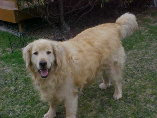 Buddy is here and he is a BIG boy. Last time he was weighed he tipped the scale at 144 lbs. He is tall and long, plus overweight. Definitely a gentle giant and typical Golden. Lady was not happy that was here but he put up with her. He has been living in a garage for 2 years so he had a very thick, dirty and matted coat. We spent a few hours brushing, cutting out mats and bathing and he now looks and smells much better! He has had minimal human interaction for the past 2 years, so he's very happy to receive love and give it right back :) He's been eating Tuffy's and has not been to a vet for shots for a long time - owners were not sure when and do not have his records. He has not been exercised because dad was too busy with work and mom was allergic to him. He didn't have toys because he tore them up, but we've found he loves toys of all kinds and is happily tearing them up here. He loves to chase tennis balls and is very good at bringing it back and dropping it. He can't do it for too long because he gets winded, but he loves it. He loves squeak balls and constantly rolls them under chairs, then barks at us to get them - I think this is a game. Sometimes he just barks for no apparent reason - guess he's just happy to be here and out of the garage. He likes raw hides and goes through those pretty fast. Also enjoys pulling stuffing out of toys. He has been so busy since he came I have not seen him ever take a nap. He is a beautiful blonde color and has been neutered. Has not had obedience training but knows sit. Likes to steal things and climbs up on the sofa to get the remote control. He gives it up easily and then waits for the next opportunity to steal it. For some reason the remote control is his absolute favorite thing. If he can't get that he'll settle for a dog brush or whatever else he can find. Sometimes he cries and whines when he can't see us or if he wants to go outside. We found out today that he even likes being vacuumed. We decided to try it because of the massive amounts of hair coming off of him and he didn't want us to stop! He will counter surf any chance he gets. He tried to jump on the bed today but he couldn't quite make it - guess he's a little too chubby. I really don't want to encourage him to jump because at his weight he could hurt himself.