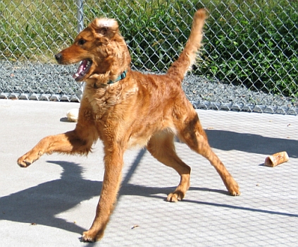 He loves other dogs and cats and everyone he meets. When he first came, he did a bit of mouthing, but has since learned that mouthing is not allowed. A simple no or ah ah and he quits. When he first came he did a little guarding of rawhides, but with some simple training, he nows gives them to me in exchange for loving. He wants so much to behave! He jumps up a little and we continue working with that. He would probaly be better in a house with older children, for the only reason being he might knock over little children with his bouncing! And he does bounce! Just jumps up and down and back and forth! And when you tell him sit, he does it! What more could you ask for? Humor and obedience all in one!