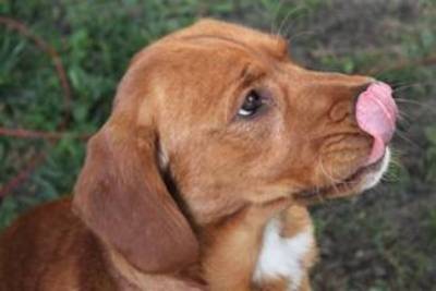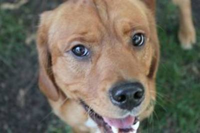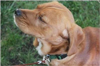 Buddy is a golden mix, weighing 34 pounds, neutered, and up to date. I am guessing he might be part Beagle or Hound. He is the size of a Beagle, with long ears and sniffs the ground on walks and in the yard like a Beagle or Hound would do. He has the coat color of a Golden Retriever and from the side he looks like a mini Golden. One thing is for sure, Buddy is a P-U-P-P-Y and 100% adorable. The pictures do not do him justice. We thought he looked like an old man in his photos, but in person he is a happy little pup. My husband and I couldn’t believe how little he was! He also sheds far less that our resident Golden. He is super soft with velvety ears.