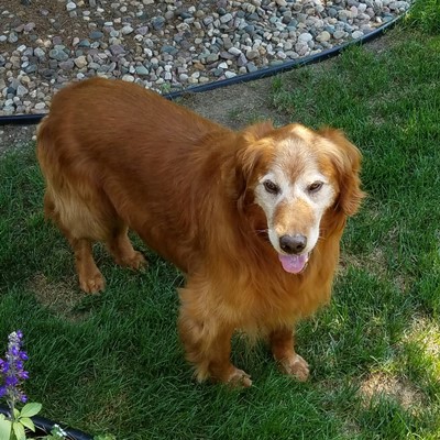 Hello, and I am pleased for you to meet Buddy 16-203, a LOVELY senior boy who is a true inspiration and story for RAGOM rescue! This white-masked senior boy came from a puppy mill breeder in another state. He turned 11 years old in January of this year (as far as we know). This boy was a stud Golden for the mill and spent all his earlier years outside in a wooden corralled 6 X 6 or so pen area with some tin over the top for cover. That is all, that is it. One of several breeders in a row.