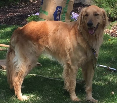 Buster is an approximately 2 year old healthy, neutered male Golden Doodle who looks all Golden. We have only had Buster in our home for a few days but here is what we know about him so far. He and our male resident dog cohabit without any issues; however, Buster has not initiated any play with our resident. Buster walks well on a flat leash and meets all humans and other dogs appropriately. The only time he pulls is if he sees a squirrel but he is easily re-directed. He has very good manners inside the house, kennels easily and does not bark or resource guard. He has been a bit nervous and skittish but we expect that to dissipate over time as he gets more comfortable in his new environment. Buster is well trained and very food/treat motivated. Although Buster has not lived with children, we have introduced him to our neighbors' kids of all ages and he was well behaved. We have not tested him with cats but do not think cats will be an issue as he does not have a high prey drive. Buster needs a family who doesn't mind a velcro dog-he is happiest when being pet and lying by your feet. He will also need a family willing to work on his confidence and slowly acclimate him into his new home. I've attached photos of Buster getting a bath and him "helping" with some yard work this weekend. Please contact your placement advisor if you would like to meet Buster.