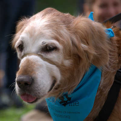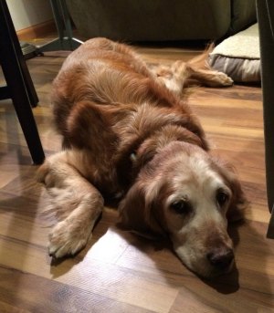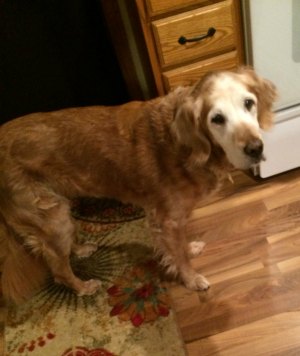 Bizzy 05-335 is a returning RAGOM dog due to her owners moving. She is 13 years old - will be 14 on Sept. 30th. Bizzy is a PB Golden, weighs around 60 lbs, spayed, just had her Rabies shot, good with kids, has not been around cats. Bizzy will bark if she see's a dog while on a walk. When she use to visit Grandpa's home he had a dog and there were no issues with guarding food/toys. Bizzy has no guarding issues with humans. Bizzy does have spring/summer allergies and her tummy will get red and irritated from the grass. They've tried Benadryl and she gets an upset tummy from that so they use Aloe Gel on her tummy and that seems to help. Bizzy is an indoor dog, will use a crate sometimes and is given a treat when she goes in. Free roam, loves car rides, no anxieties and unknown on baby gates. She does like Kleenex and will take them out of the garbage when you leave the home. Bizzy also likes panties - she will rip them apart. It is unknown if she ingests any parts of the panties. Bizzy is at the age now where she likes to go outside, sniff some, do her jobs and come right back inside. But if she see's a deer she will chase it. Bizzy can still take the stairs with no problems, but does need help getting in and out of a car.
