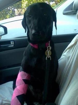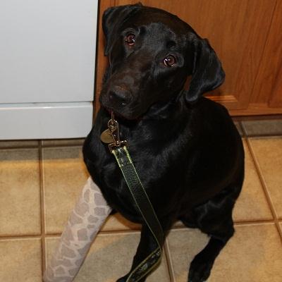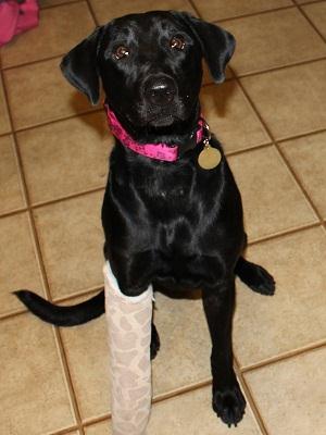 As you can tell, Cady doesn’t look like your typical Golden. She is a black Lab/Golden Retriever mix, though she looks more like a black Lab. Her heart is pure gold and she is one of the sweetest, most loving dogs I’ve ever met. She is 58 pounds, and is smaller in size. She is great with kids (I have a 7 year old daughter), completely ignores my two cats, and is great with dogs. Cady loves car rides and doesn’t seem to have any anxieties. She did try to jump up and counter surf a lot the first few days, but has learned that we don’t allow that, especially with a broken leg! She does need some obedience training, but she is a very smart dog and will learn commands and manners quickly. She won’t be able to get much training while she heals, but as her leg gets stronger she will be able to do more training activities.