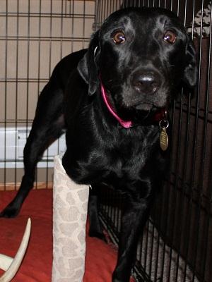 The first few days here she didn’t want to go in her kennel, but now she goes in willingly, which is good since she will be spending a lot of time there while her leg heals. Most of the time she is willing to rest in her kennel, sleeping on a very comfy dog bed. Cady is current on her vaccines and heartworm test and we will continue to use heartworm and flea/tick prevention.