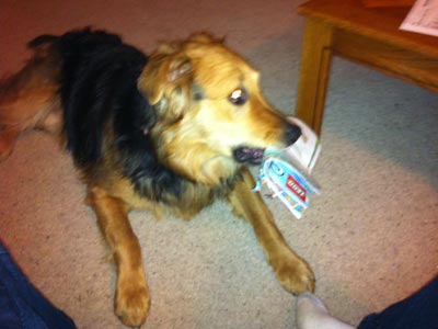 I do have to brag a little and tell you of how cute I am!! My fosters son had some homework rolled up with a rubber band like the newspaper, so I figured I'd pick it up and bring it to my foster parents. They thought I was so cool they had me do it again and again and again until they got a some what of a good picture of me doing it. I would love to show you this trick sometime.