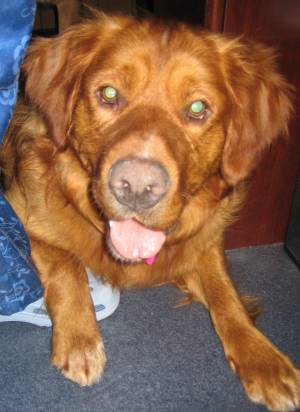 The jury is still out about whether Chance is a purebred Golden Retriever or a mix. The shelter listed him as a mix, but only because of his size. He looks 100% golden except for his giant head, chest and paws. He's the same height as our PB male, but much wider. My best guess is that he's at least 75% Golden but maybe has a little Newfoundland or Saint Bernard in his heritage. But it's also possible that he's PB and just comes from lines with exceptionally big blocky heads. Whatever he is, he's gorgeous. He has a luxurious red wavy coat, a big handsome square head, and the most adorable white patch on his chest. He's a truly handsome dog.