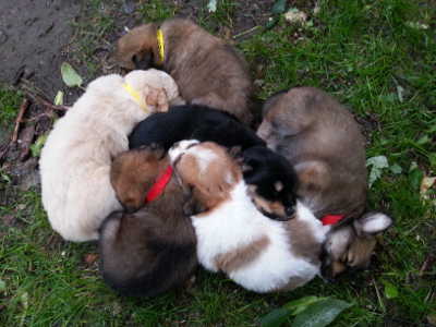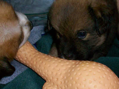 Cinnamon is a dark brown and black cutie with some light brown on her feet and around her neck. She is a little snuggler and likes to be picked up for hugs. She is hard to tell apart from her brother Drake 13-154 and sister Wren 13-149. Cinnamon has less black on her back than Drake and only one white front foot where Wren has two. At her 4-week checkup, Cinnamon weighed in at 3.56 lbs. In the pile of puppies picture, she is on the far right with her ear flipped.