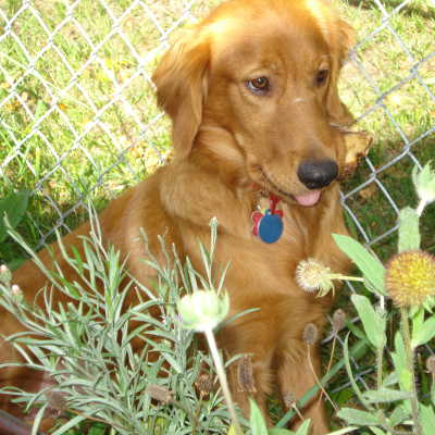 Cloe loves people and greets them when they visit. She knows they can’t resist loving her up. She does well with our older children and enjoys our two RAGOM Goldens very much. They have taught her much about being a dog. We do not know how she would do with cats. Since Cloe came from a commercial breeder and missed out on some important socialization, she requires another medium to large breed, well-socialized dog in her forever home; no children under the age of 10, as young kids and their sudden moves and unexpected noise will frighten her; and a fenced yard as she is still learning recall.