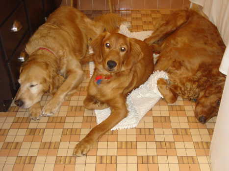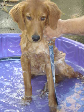 I'd like to introduce Cloe. She is an 8-month-old purebred Golden who is one of the 133 dogs seized from a breeder in Pine River back in July. Cloe spent 6 weeks or so at the Animal Humane Society while the court case was being decided, and she has been at our house for a little over a month. All the dogs were finally signed over to the humane society two weeks ago. Most of the Goldens were adopted out via the humane society, but because some of the dogs required more socialization and care, RAGOM was able to take a number of the dogs into our rescue.