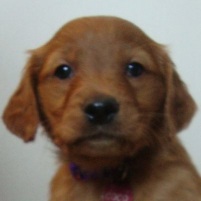 Coco is our darkest red girl, and she loves to cuddle up to her mama. Her favorite position when she was younger was laying over her mom’s neck like a scarf! She is our most vocal pup, and is so much fun to watch. Coco is currently 6 weeks and weighs 6 1/2 pounds. She has been dewormed, has been treated for coccidia and giardia, and has received her first set of shots.