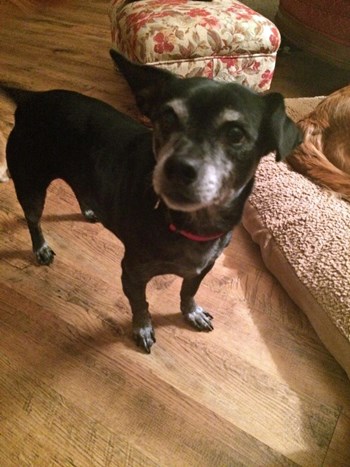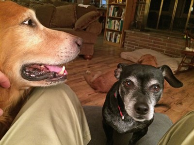 Cocoa and his buddy Champ have settled right into our house and routine. They get along well with resident dog (RD) Harley and foster-sister Sandy. Cocoa weighs only 19 lbs. but he has no problem or fear moving among the three much larger dogs (65 lbs., 80 lbs., and 84 lbs.) On walks he wants to stay up front with the two big boys. His favorite indoor activity is to find a nice warm lap to curl up in. At night he likes to burrow down underneath the bed covers and curl up in a compact ball at the foot of our bed.