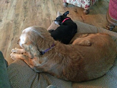Cocoa is a little peanut of a guy. We know that he has some Terrier and Chihuahua in his background (and who knows what else). Unlike the Golden Retrievers that we’re used to, Cocoa doesn’t walk around with a big smile on his face. Instead we say that he smiles with his tail. His tail is constantly wagging and its speed increases the happier he gets! He loves kids, adults and other dogs. At some point he was obviously loved and cared for as he has no fear of either dogs or humans. He likes to be wherever you are if you are active but, when things settle down, he heads for one of the big comfy dog beds. Here he is sharing a bed with our 11 year old foster girl Sandy.