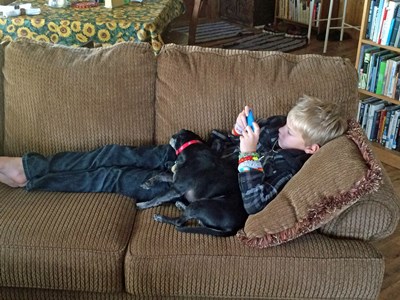 In the week we’re had him he has had no accidents in the house. He loves kids and loves to cuddle up on your lap. Here he is with our grandson Owen.