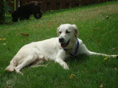 Hey RAGOM fans let me introduce to you miss Corvette. She came into RAGOM's care with several other dogs from a breeder in ND. Corvette has been in my home since Labor Day weekend. She looks almost identical to miss Carrera. Corvette is a petite young girl that is 2.5 years old and she is an English Creme Golden Retriever. What I can tell you about this girl is that she is very shy and timid, like many former puppy mill dogs. She follows the lead of my resident dogs, Indy and Lauren, and is slowly learning that this is really the good life now. FD has been taking the full pack (all 4 dogs) for walks at night as much as we can. Corvette is getting used to the Gentle Leader but the first 2-3 blocks she tries her hardest to wiggle out of it. Once she realizes this isn't going to happen she falls in place and follows the other dogs. When we encounter other walkers, dogs, bike riders, etc. Corvette becomes very nervous. Sometimes we veer off of the trail and onto a lawn until the other party has passed.