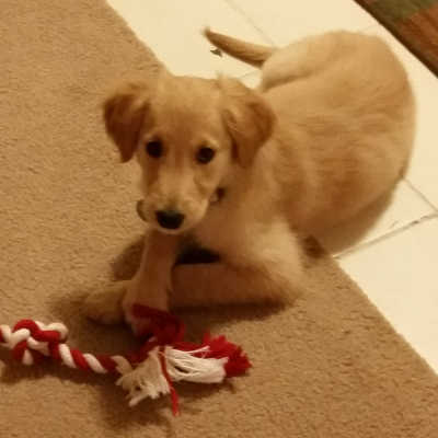 Dixie was born on 10-31-2015. Her Mom was a Collie with a dash of Aussie, super friendly, gentle, and people-oriented. Dad was the neighbor Golden Retriever. Dixie was part of an unplanned litter and was surrendered from the owners. The Mom had another litter of puppies about 1 year ago and those dogs looked very much like a Golden, with a slightly larger nose. They wieghed about 50 lbs, so that may be an indication of what Dixie will weigh as an adult.