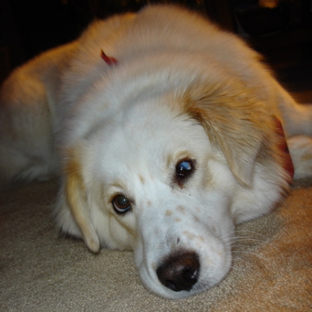 Dolly is a beautiful 1-2 year old rescued female Golden/Pyr mix. Dolly wants nothing more than to find a loving forever home with someone who will be home most of the time to give her lots of attention. She is a real cuddle-bug who will lay by your side for hours while you scratch her ears and belly. She is about 45 lbs. as she was a stray and underweight, but will likely be about 55 lbs. when she is up to normal weight. Dolly loves to ride in the car, gets along fine with other animals, knows basic commands, walks well on a leash and is extremely well behaved in the house. Dolly is spayed, UTD on shots and is in fine physical health. An old injury caused the loss of sight in her left eye, but this does not bother her at all. Dolly would be an ideal indoor companion for either a single or adult couple.