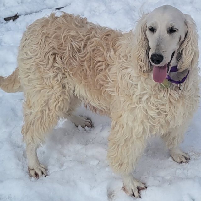 Ellie is a beautiful purebred Goldendoodle who was retired from breeding and is now with RAGOM. She is quickly adapting to the life of luxury living indoors and clearly loving it completely. Ellie will need another medium to large confident dog in the home to continue her learning process. Her home can have children over the age of 8 and she can live with cats. She needs a physical fence to keep her safe. Ellie is quickly discovering how wonderful human attention can be and will be a wonderful family companion.