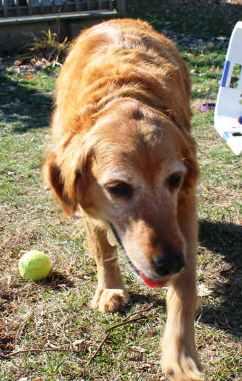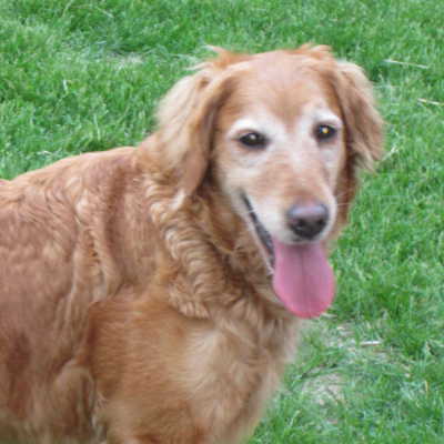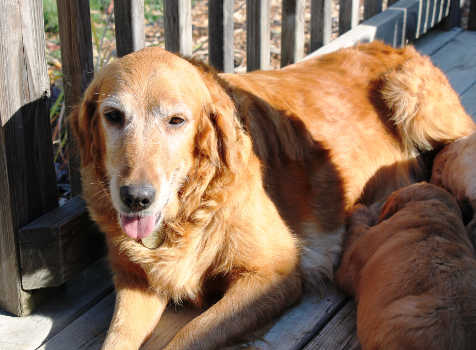 Erika is a sweet, dark red, 5-year-old Golden who is retiring from the breeding life. She has 5 puppies that she is currently taking care of: Ezra, Ethan, Enzio, Etta, and Evan. This will be her last litter, and then she will be spayed and ready to have a family of her very own. Erika is adapting to living life indoors. She is very sweet, but shy and is slowly coming out of her shell. She has from day 1 run up to my husband, me, and my daughter with tail wagging, giving kisses and looking for pets, and is learning new things each day. She now navigates our stairs pretty well with a little gentle coaxing, is learning to do her business outside, and she is learning how to walk on a leash.