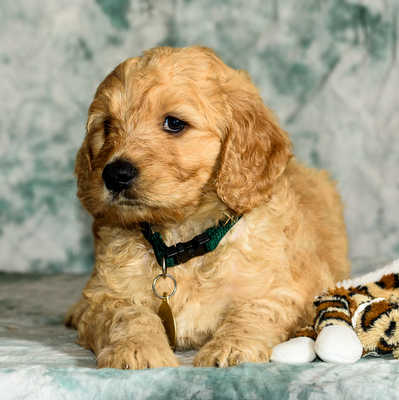 On Thursday, March 3, 2016, seven healthy Goldendoodle puppies were born at a RAGOM foster home. The litter has an Irish name theme since their mom and both foster brothers have Irish names, plus they were born so close to St. Paddy’s Day! Over the past 6 weeks, they have grown in leaps and bounds and are now looking for their forever home! They are happy, healthy, chubby little puppies that love to play outside and to get attention from people. Their mom is a small purebred Golden Retriever that came from a breeder who had both Golden Retrievers and Poodles. The puppies have been handled since day one, so they are used to being held and they love human touch! They have experienced kids from ages 3 and up. They have also been raised with our two Goldens, ages 4 and 1. They have been exposed to cats and aren’t too sure what to think about them, but they would do fine in a household with cats. The puppies have been dewormed every two weeks and will have their first vet visit and vaccinations on 4/28. They will be spayed/neutered the first week of May after they turn 8 weeks old and they will be ready to go to their forever homes after that! The puppies are growing quickly! Last week, at 5 weeks old, they weighed between 6 and 7.5 pounds. All of the puppies are very sweet and have great personalities! The families that adopt these babies will be very lucky!