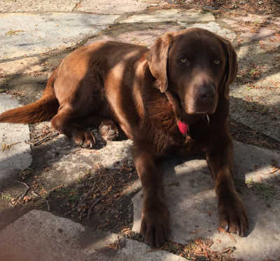 Meet Fuzzy, an honorary Golden, who came to us as a stray. She is a beautiful Chocolate Lab with that blocky Lab head and shiny coat. Her eyes are stunning. Fuzzy is approximately 10 years old, is up-to-date on all shots and will be spayed within the next two weeks.