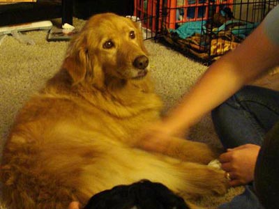 On Ginger's first night here, she was pretty low key and observant. She was in desperate need of some grooming, so I began combing her out and got an entire plastic grocery sack of fur out of her- and have gotten even more out in the days since. She has a beautiful tail and feathering on her legs. It appears that at one point she was shaved and it's starting to come back. I think she will be even more gorgeous once her entire honey colored coat fills in!