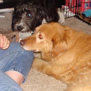 Also residing at the foster home is a 7 month old Sheltie/Bichon puppy, who can be pretty rambunctious! He loves to play with her, and even got her to play back a few times. She play bows and wrestles around a bit before she decides that she's done. We first introduced them outside and she did fine. We recommend that she meets all dogs outside initially - friends came over with their lab and cocker and Ginger was a bit grumbly/growly at them but was wagging her tail the whole time. Once they were outside and had room to properly sniff each other, she did well. We're on Day 3 with Ginger and she and Toby are more and more buds every day. I think she would do really well in a home with other dogs and she has been a wonderful influence on our puppy!