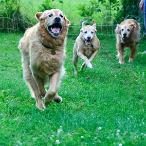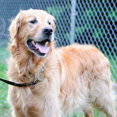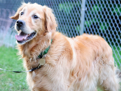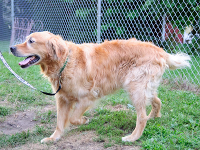 Grady is a happy, broad-chested, 67-lb boy with a beautiful gold coat and blond undercarriage. His most distinctive feature, though, is his short, feathery tail. It's not clear why his tail is so short, but we know it's been this way since he was a puppy. One thing's for sure--he won't be sweeping anything off the coffee table with it!