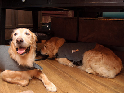 Storm anxiety? Definitely an area to work on. A storm blew through on the first night Grady was at my home. I put a Thundershirt on him and gave him some Rescue Remedy (a combination of flower essences that can have a calming effect). He rode out the storm under my desk, appearing nervous but not overly so. I'm hopeful that these and other calming techniques will help him not to be so stressed.
