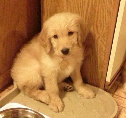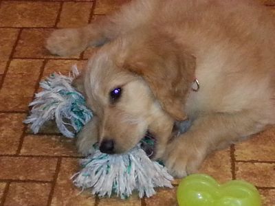 Snuggly. Soft. Playful. Intelligent. Sweet. Words that come to mind when I try to describe Griffin, a 9 week old Goldendoodle puppy. Griffin and his sister, Gabby 16-005 came to rescue from a breeder. He looks a great deal like a Golden Retriever in his coloring but has some lighter areas, the start of a Doodle beard and a cute docked tail. He has a lovely personality. He’s quiet and watchful in new situations, like his visit to the vet. At home, he’s very playful by himself with toys. With my big dogs, he’s chasing or playing tug of war. He loves the snow. He runs through drifts, digs little holes, climbs to the top of snow piles and pushes snow around, playfully chasing snow balls. He is very much Golden but has some Doodle moves as he plays.