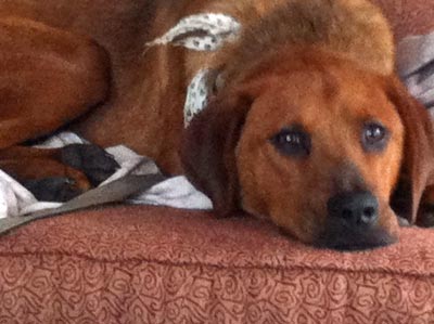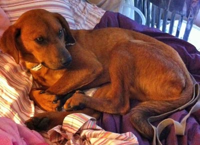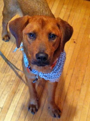 He's in great shape--clean ears, pretty clean fur--and he's got a great personality. He's been exploring when he can, and when it's time to settle down, he has no problem napping by my feet. Or this morning, he jumped on the bed and showed what a cuddler he is. He met the cat, and was totally non-plussed, but the cat thought he had to teach him a lesson anyway and gave poor Handsome a swat on his nose; all he did was look bewildered after that. He's done great with the resident dogs, following Moe wherever the action is. He ate his food nicely this morning, and then went and found a few stray bits of kibble. He's not totally housebroken, I found out, as he had an accident this morning, but now that I know, I'll keep an eye on him and try to get that training started. HE LOVES affection, and can't get enough pets! He also loves bones. He seems to have a great personality and is a very sweet boy. I look forward to seeing how he does over the next couple of days!