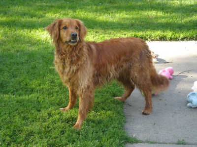 Introducing new RAGOM girl, Hope. She is 6 years old until her birthday on July 8th. She is a beautiful girl. Her coat has about four different shades of red and she is blond on her belly. Hope came into RAGOM because she was reported to have storm anxiety. We have not had any storms so I am not able to report on that yet. Her previous family gave her a medication when it would storm outside. She also was put into her kennel with a blanket over it to keep her calm during storms. Hope does respond well to a Thundershirt, so she will need one in her future forever home.