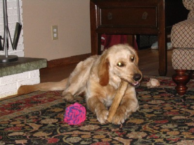 Jeeter definitely has the Golden trait of loving to rip up toys to get the squeeky out. The ripping up seems to be restricted to toys because I noticed that she also likes to collect my things and hoard them by her crate. I finally found my wallet in a pile of Jeeter's toys and was able to buy my much needed cup of coffee before work. (Oh, she also ripped up a water bill I accidentally left on the kitchen table, but I did not want to pay it anyway.)