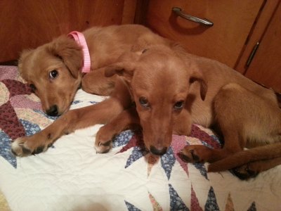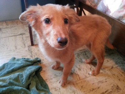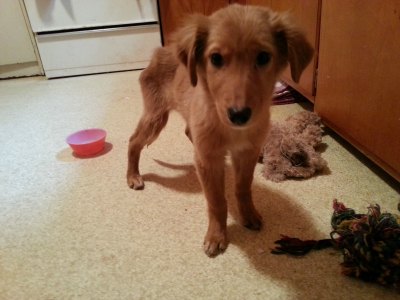 I would like to introduce Kai to RAGOM. Kai is a 5 month old Golden Retriever/Collie mix and as sweet as they come. She was one of 8 dogs (7 puppies and 1 – 1 year old) that came into RAGOM from a hoarding/abuse situation in Cando, North Dakota. Scared, sick and truly skin and bones from being fed corn, grain and scraps every 3-4 days, our sweet Kailey Bear arrived with her sister Dreamer very late on a stormy Friday evening after a 800-mile trip to deliver all the dogs to their new foster homes (thank you so much Mark and Barry and everyone else that helped with that transport – that was a LOT of miles!).