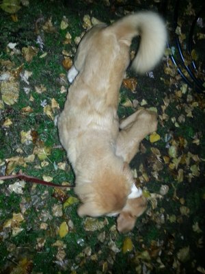 She found it somewhere. And I am honestly amazed and completely, happily, surprised that she is still here today. Kai had a very rough several of days; actually this whole past week has been rough. There have been several days where she went back to hardly eating anything, and then she had horrible diarrhea so we started worrying about dehydration again. But this past Friday evening was another turning point for her. Exactly two weeks after she arrived she started eating again. And eating with enthusiasm!! We had been trying to tempt her with all sorts of things, but it was the boiled hamburger that did it again. She is now eating everything we put in front of her in addition to a fair amount of kibble. She is dancing around for love in the mornings or when I come home – even putting her feet up on the baby gate when we get near. Kai has been playing with Dreamer – tug-a-war and some wrestling. She is alert and watchful, and happy. Her energy level is still very low, but she is still recovering from a lot.